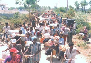 As the LTTTE began shifting its possessions, there was alarm. The camps with refugees from the Islands and Valikamam North also began to be shifted out to Thenmaratchi and Killinochchi. The dominant question in the minds of people was, "What is to become of us?" On the one hand the LTTE was evasive. Had it told the people of its intentions, there could have been an orderly exodus. The LTTE instead repeated that it would fight to keep the army out, and, even more emphatically, pressed the people to make their contributions to the LTTE's National Defense Fund.